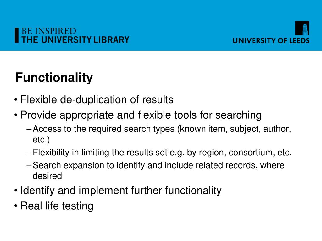Functionality • Flexible de-duplication of results • Provide appropriate and flexible tools for searching • Access to the required search types (known item, subject, author, etc.) • Flexibility in limiting the results set e.g. by region, consortium, etc. • Search expansion to identify and include related records, where desired • Identify and implement further functionality • Real life testing