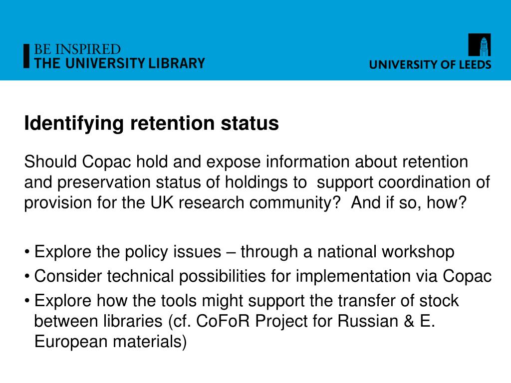 Identifying retention status Should Copac hold and expose information about retention and preservation status of holdings to support coordination of provision for the UK research community? And if so, how? • Explore the policy issues – through a national workshop • Consider technical possibilities for implementation via Copac • Explore how the tools might support the transfer of stock between libraries (cf. CoFoR Project for Russian & E. European materials)