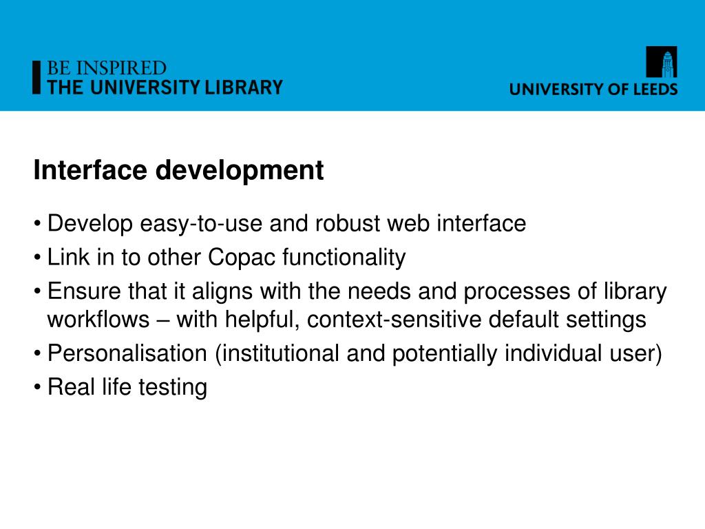 Interface development • Develop easy-to-use and robust web interface • Link in to other Copac functionality • Ensure that it aligns with the needs and processes of library workflows – with helpful, context-sensitive default settings • Personalisation (institutional and potentially individual user) • Real life testing