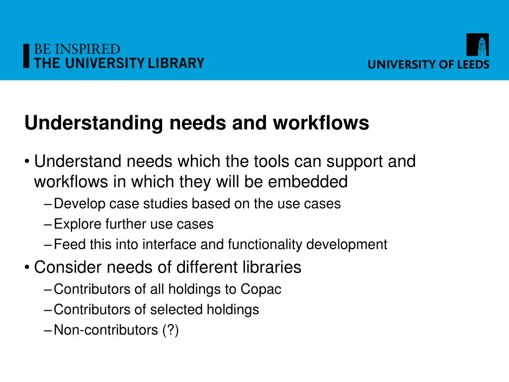 Understanding needs and workflows • Understand needs which the tools can support and workflows in which they will be embedded • Develop case studies based on the use cases • Explore further use cases • Feed this into interface and functionality development • Consider needs of different libraries • Contributors of all holdings to Copac • Contributors of selected holdings • Non-contributors (?)