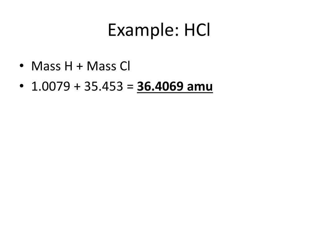 Example: HCl • Mass H + Mass Cl • 1.0079 + 35.453 = 36.4069 amu