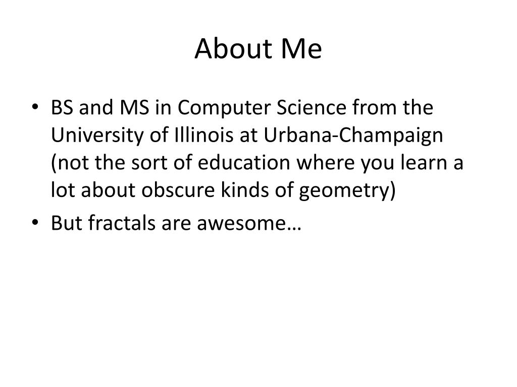 About Me • BS and MS in Computer Science from the University of Illinois at Urbana-Champaign (not the sort of education where you learn a lot about obscure kinds of geometry) • But fractals are awesome…