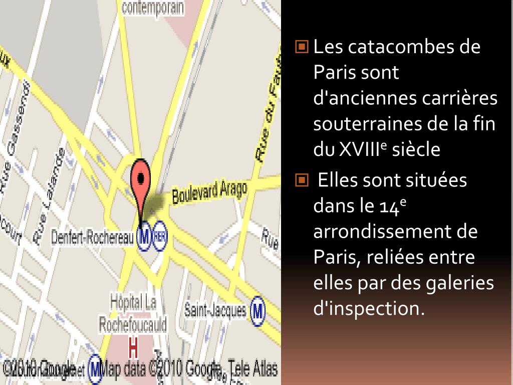 Les catacombes de Parissont d'anciennes carrières souterraines de la fin du XVIIIe siècle • Elles sont situées dans le 14e arrondissement de Paris, reliées entre elles par des galeries d'inspection.