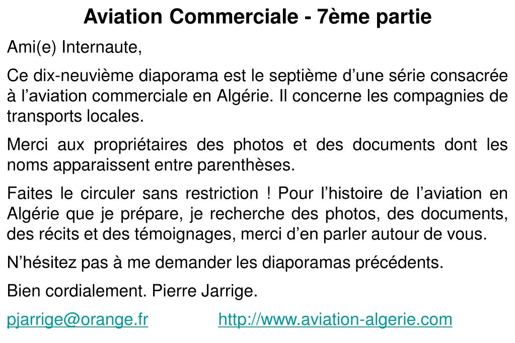 Aviation Commerciale - 7ème partie Ami(e) Internaute, Ce dix-neuvième diaporama est le septième d’une série consacrée à l’aviation commerciale en Algérie. Il concerne les compagnies de transports locales. Merci aux propriétaires des photos et des documents dont les noms apparaissent entre parenthèses. Faites le circuler sans restriction ! Pour l’histoire de l’aviation en Algérie que je prépare, je recherche des photos, des documents, des récits et des témoignages, merci d’en parler autour de vous. N’hésitez pas à me demander les diaporamas précédents. Bien cordialement. Pierre Jarrige. pjarrige@orange.frhttp://www.aviation-algerie.com