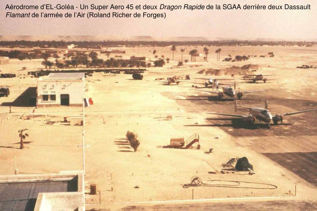 Aérodrome d’EL-Goléa - Un Super Aero 45 et deux Dragon Rapide de la SGAA derrière deux Dassault Flamant de l’armée de l’Air (Roland Richer de Forges)