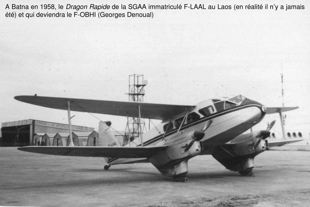 A Batna en 1958, le Dragon Rapide de la SGAA immatriculé F-LAAL au Laos (en réalité il n’y a jamais été) et qui deviendra le F-OBHI (Georges Denoual)