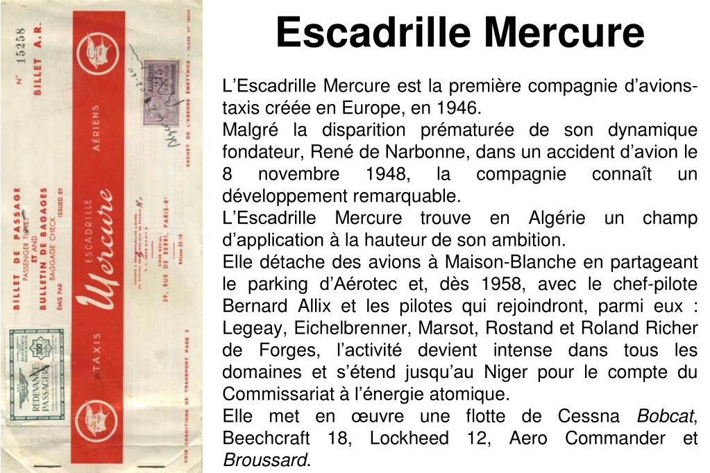 Escadrille Mercure L’Escadrille Mercure est la première compagnie d’avions-taxis créée en Europe, en 1946. Malgré la disparition prématurée de son dynamique fondateur, René de Narbonne, dans un accident d’avion le 8 novembre 1948, la compagnie connaît un développement remarquable. L’Escadrille Mercure trouve en Algérie un champ d’application à la hauteur de son ambition. Elle détache des avions à Maison-Blanche en partageant le parking d’Aérotec et, dès 1958, avec le chef-pilote Bernard Allix et les pilotes qui rejoindront, parmi eux : Legeay, Eichelbrenner, Marsot, Rostand et Roland Richer de Forges, l’activité devient intense dans tous les domaines et s’étend jusqu’au Niger pour le compte du Commissariat à l’énergie atomique. Elle met en œuvre une flotte de Cessna Bobcat, Beechcraft 18, Lockheed 12, Aero Commander et Broussard.