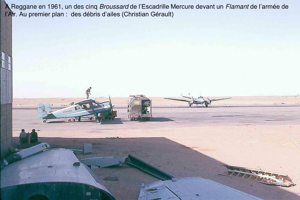 A Reggane en 1961, un des cinq Broussard de l’Escadrille Mercure devant un Flamant de l’armée de l’Air. Au premier plan : des débris d’ailes (Christian Gérault)