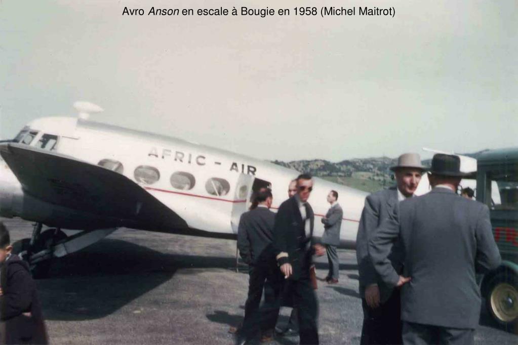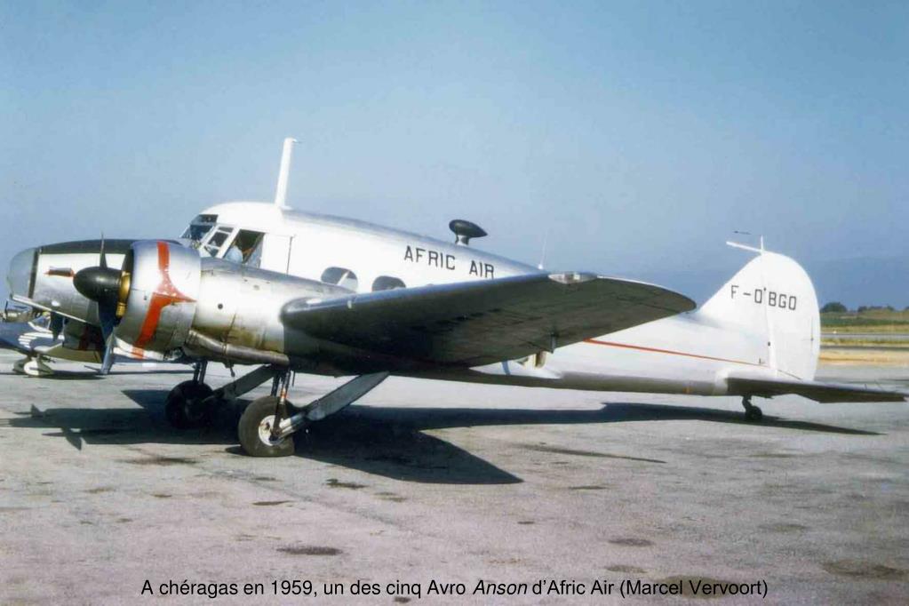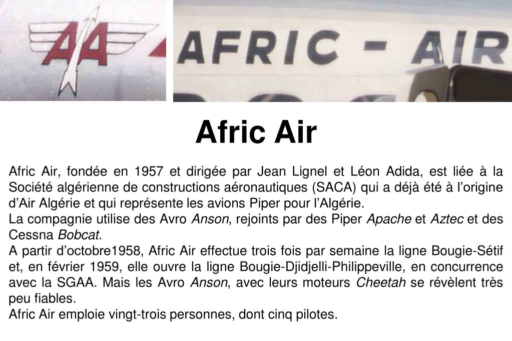 Afric Air Afric Air, fondée en 1957 et dirigée par Jean Lignel et Léon Adida, est liée à la Société algérienne de constructions aéronautiques (SACA) qui a déjà été à l’origine d’Air Algérie et qui représente les avions Piper pour l’Algérie. La compagnie utilise des Avro Anson, rejoints par des Piper Apache et Aztec et des Cessna Bobcat. A partir d’octobre1958, Afric Air effectue trois fois par semaine la ligne Bougie-Sétif et, en février 1959, elle ouvre la ligne Bougie-Djidjelli-Philippeville, en concurrence avec la SGAA. Mais les Avro Anson, avec leurs moteurs Cheetah se révèlent très peu fiables. Afric Air emploie vingt-trois personnes, dont cinq pilotes.
