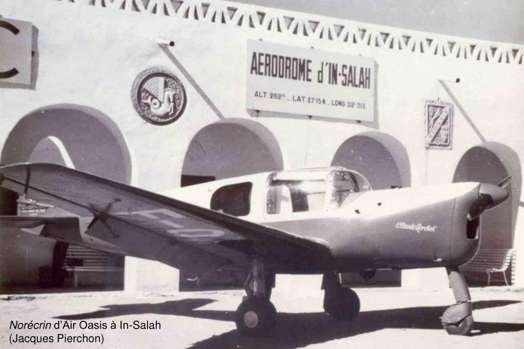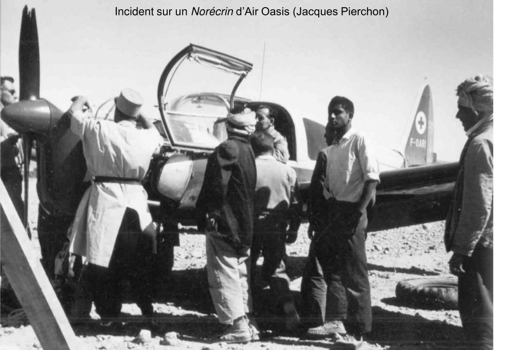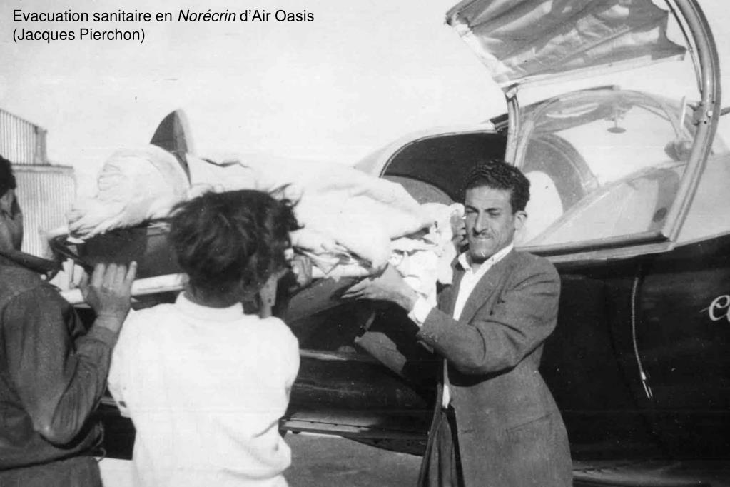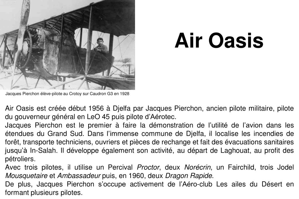 Air Oasis Jacques Pierchon élève-pilote au Crotoy sur Caudron G3 en 1928 Air Oasis est créée début 1956 à Djelfa par Jacques Pierchon, ancien pilote militaire, pilote du gouverneur général en LeO 45 puis pilote d’Aérotec. Jacques Pierchon est le premier à faire la démonstration de l’utilité de l’avion dans les étendues du Grand Sud. Dans l’immense commune de Djelfa, il localise les incendies de forêt, transporte techniciens, ouvriers et pièces de rechange et fait des évacuations sanitaires jusqu’à In-Salah. Il développe également son activité, au départ de Laghouat, au profit des pétroliers. Avec trois pilotes, il utilise un Percival Proctor, deux Norécrin, un Fairchild, trois Jodel Mousquetaire et Ambassadeur puis, en 1960, deux DragonRapide. De plus, Jacques Pierchon s’occupe activement de l’Aéro-club Les ailes du Désert en formant plusieurs pilotes.