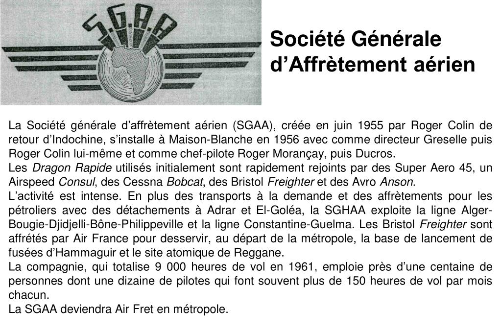 Société Générale d’Affrètement aérien La Société générale d’affrètement aérien (SGAA), créée en juin 1955 par Roger Colin de retour d’Indochine, s’installe à Maison-Blanche en 1956 avec comme directeur Greselle puis Roger Colin lui-même et comme chef-pilote Roger Morançay, puis Ducros. Les Dragon Rapide utilisés initialement sont rapidement rejoints par des Super Aero 45, un Airspeed Consul, des Cessna Bobcat, des Bristol Freighter et des Avro Anson. L’activité est intense. En plus des transports à la demande et des affrètements pour les pétroliers avec des détachements à Adrar et El-Goléa, la SGHAA exploite la ligne Alger-Bougie-Djidjelli-Bône-Philippeville et la ligne Constantine-Guelma. Les Bristol Freighter sont affrétés par Air France pour desservir, au départ de la métropole, la base de lancement de fusées d’Hammaguir et le site atomique de Reggane. La compagnie, qui totalise 9 000 heures de vol en 1961, emploie près d’une centaine de personnes dont une dizaine de pilotes qui font souvent plus de 150 heures de vol par mois chacun. La SGAA deviendra Air Fret en métropole.