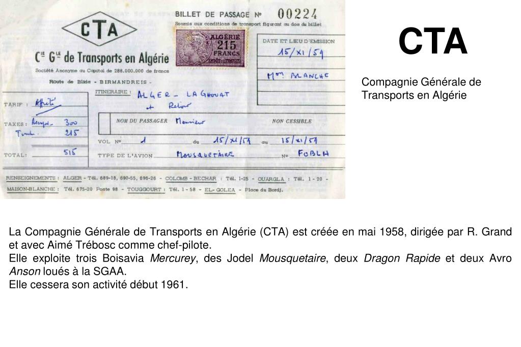 CTA Compagnie Générale de Transports en Algérie La Compagnie Générale de Transports en Algérie (CTA) est créée en mai 1958, dirigée par R. Grand et avec Aimé Trébosc comme chef-pilote. Elle exploite trois Boisavia Mercurey, des Jodel Mousquetaire, deux Dragon Rapide et deux Avro Anson loués à la SGAA. Elle cessera son activité début 1961.