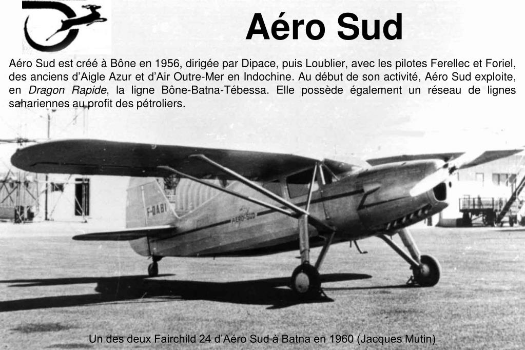 Aéro Sud Aéro Sud est créé à Bône en 1956, dirigée par Dipace, puis Loublier, avec les pilotes Ferellec et Foriel, des anciens d’Aigle Azur et d’Air Outre-Mer en Indochine. Au début de son activité, Aéro Sud exploite, en Dragon Rapide, la ligne Bône-Batna-Tébessa. Elle possède également un réseau de lignes sahariennes au profit des pétroliers. Un des deux Fairchild 24 d’Aéro Sud à Batna en 1960 (Jacques Mutin)