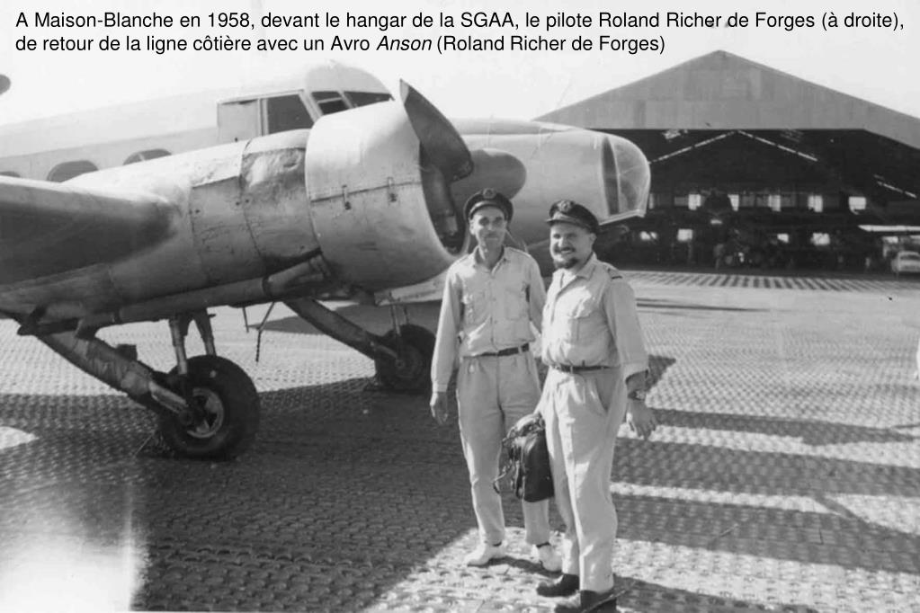 A Maison-Blanche en 1958, devant le hangar de la SGAA, le pilote Roland Richer de Forges (à droite), de retour de la ligne côtière avec un Avro Anson (Roland Richer de Forges)