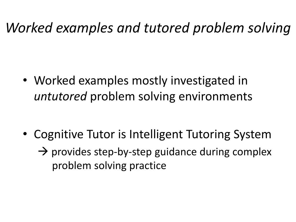 Worked examples and tutored problem solving • Worked examples mostly investigated in untutored problem solving environments • Cognitive Tutor is Intelligent Tutoring System provides step-by-step guidance during complex problem solving practice