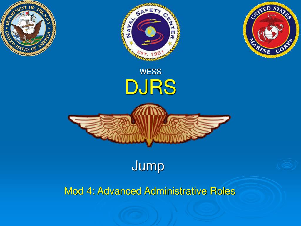 DJRS. WESS. Jump Mod 4: Advanced Administrative Roles. Welcome to the Naval Safety Center’s Training Course for the Jump portion of the Dive/Jump Reporting System (DJRS). . In this Module, we will show you: Roles that grant privileges and authority to use advanced DJRS functions