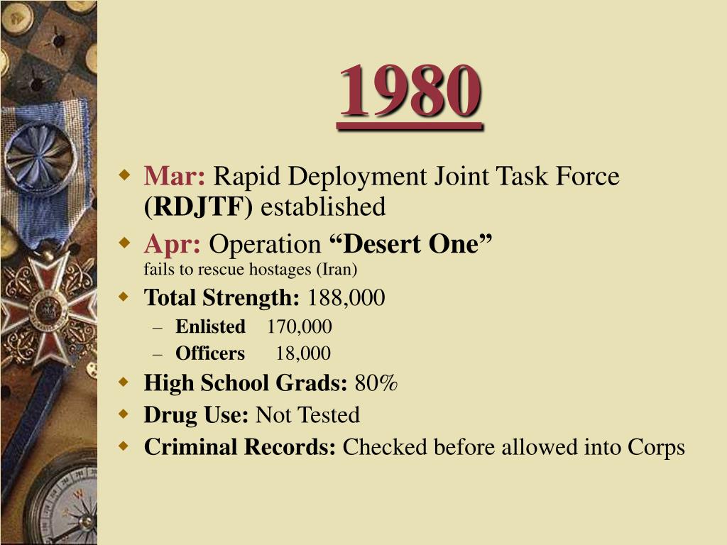 1980 • Mar: Rapid Deployment Joint Task Force (RDJTF) established • Apr: Operation “Desert One”fails to rescue hostages (Iran) • Total Strength: 188,000 • Enlisted 170,000 • Officers 18,000 • High School Grads: 80% • Drug Use: Not Tested • Criminal Records: Checked before allowed into Corps
