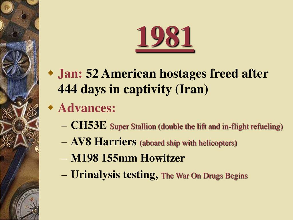 1981 • Jan:52 American hostages freed after 444 days in captivity (Iran) • Advances: • CH53E Super Stallion (double the lift and in-flight refueling) • AV8 Harriers (aboard ship with helicopters) • M198 155mm Howitzer • Urinalysis testing, The War On Drugs Begins