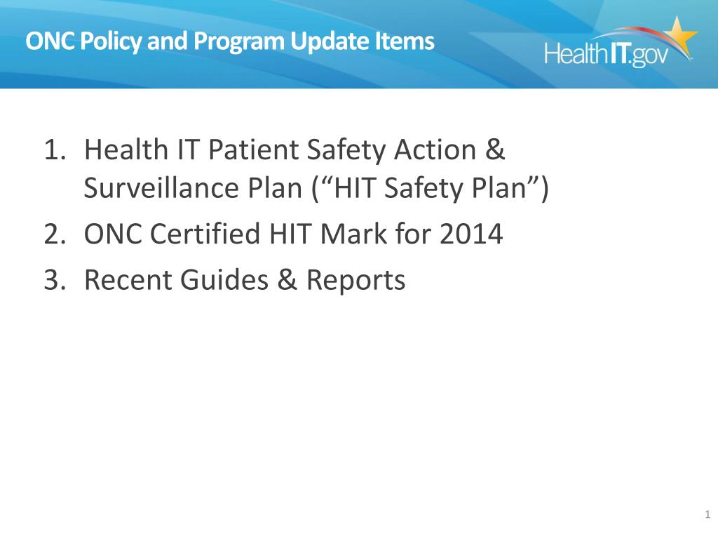 ONC Policy and Program Update Health IT Standards Committee Meeting July 17, 2013. Jodi Daniel Director, Office of Policy and Planning, ONC. ONC Policy and Program Update Items. Health IT Patient Safety Action & Surveillance Plan (“HIT Safety Plan”) ONC Certified HIT Mark for 2014