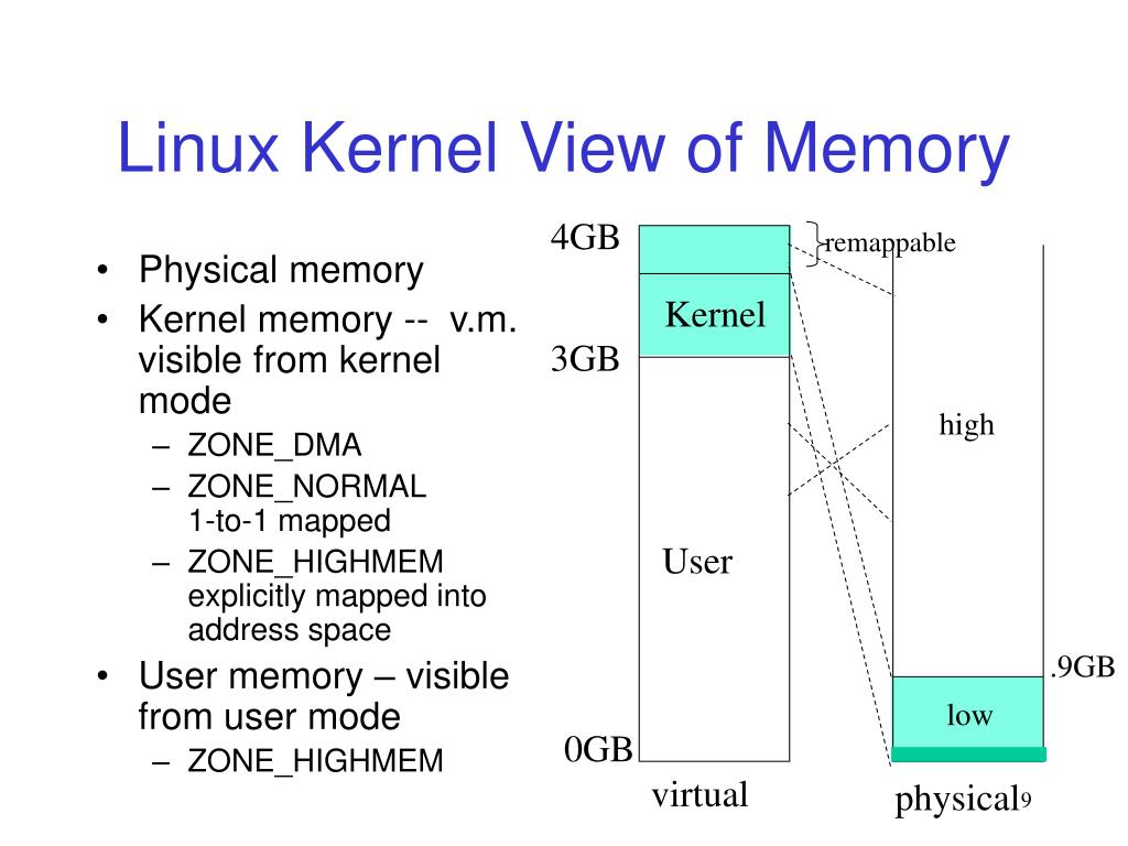 Linux Kernel View of Memory 4GB remappable Kernel • Physical memory • Kernel memory -- v.m. visible from kernel mode • ZONE_DMA • ZONE_NORMAL1-to-1 mapped • ZONE_HIGHMEMexplicitly mapped into address space • User memory – visible from user mode • ZONE_HIGHMEM 3GB high User .9GB low 0GB virtual physical