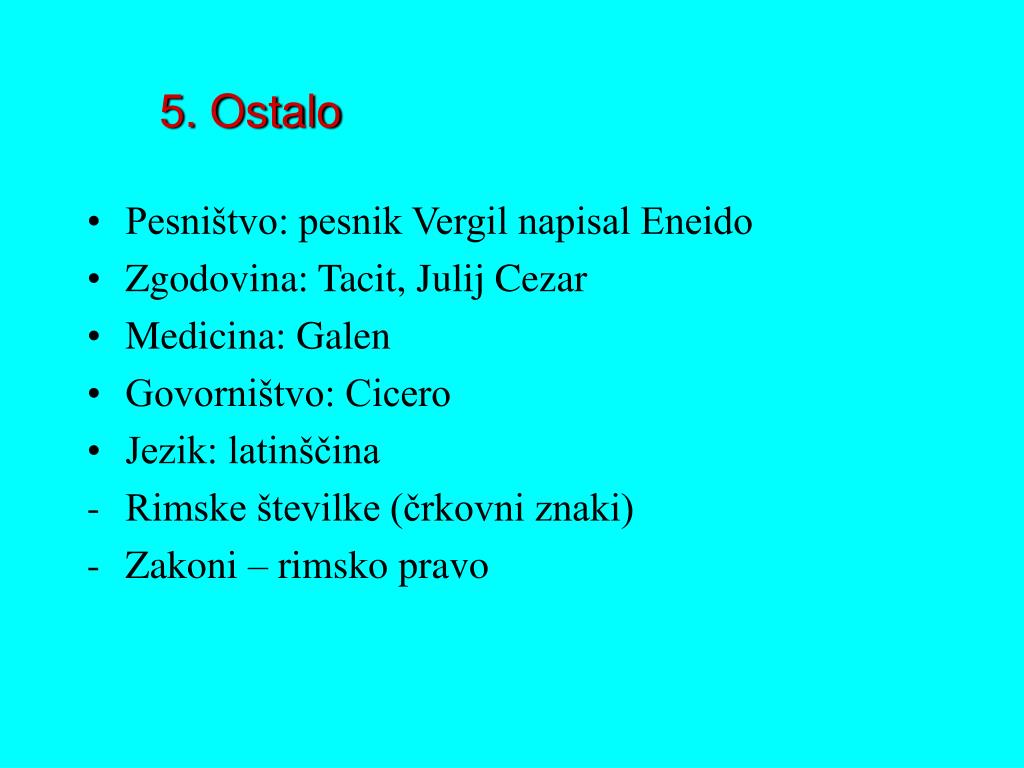 Pesništvo: pesnik Vergil napisal Eneido Zgodovina: Tacit, Julij Cezar Medicina: Galen Govorništvo: Cicero Jezik: latinščina Rimske številke (črkovni znaki) Zakoni – rimsko pravo 5. Ostalo