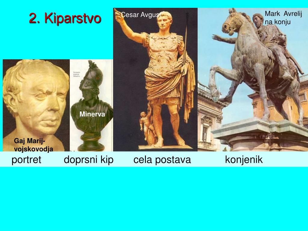 2. Kiparstvo Mark Avrelij na konju Cesar Avgust Minerva Gaj Marij- vojskovodja portret doprsni kip cela postava konjenik