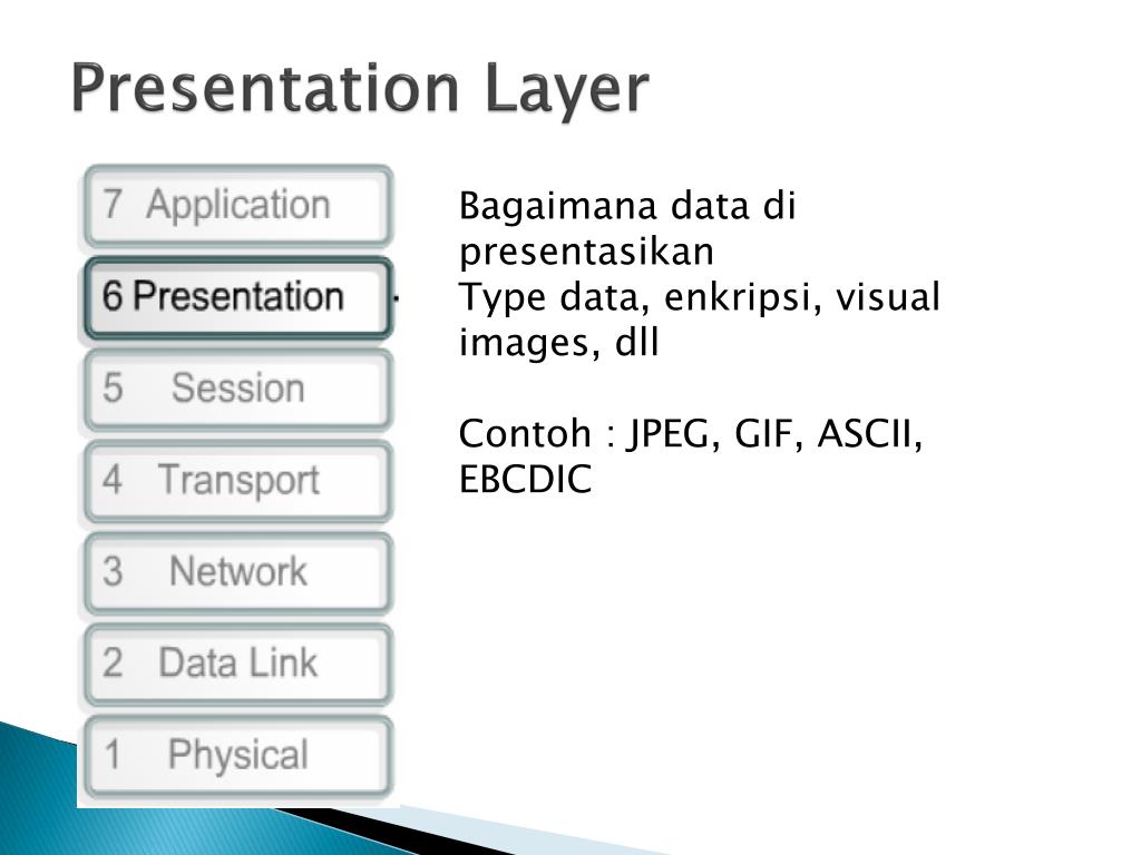 Presentation Layer Bagaimana data dipresentasikan Type data, enkripsi, visual images, dll Contoh: JPEG, GIF, ASCII, EBCDIC