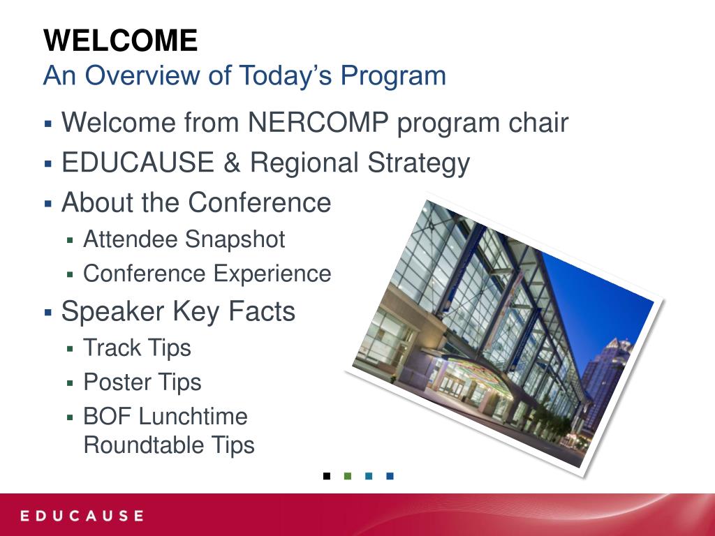 WELCOME An Overview of Today’s Program • Welcome from NERCOMP program chair • EDUCAUSE & Regional Strategy • About the Conference • Attendee Snapshot • Conference Experience • Speaker Key Facts • Track Tips • Poster Tips • BOF LunchtimeRoundtable Tips