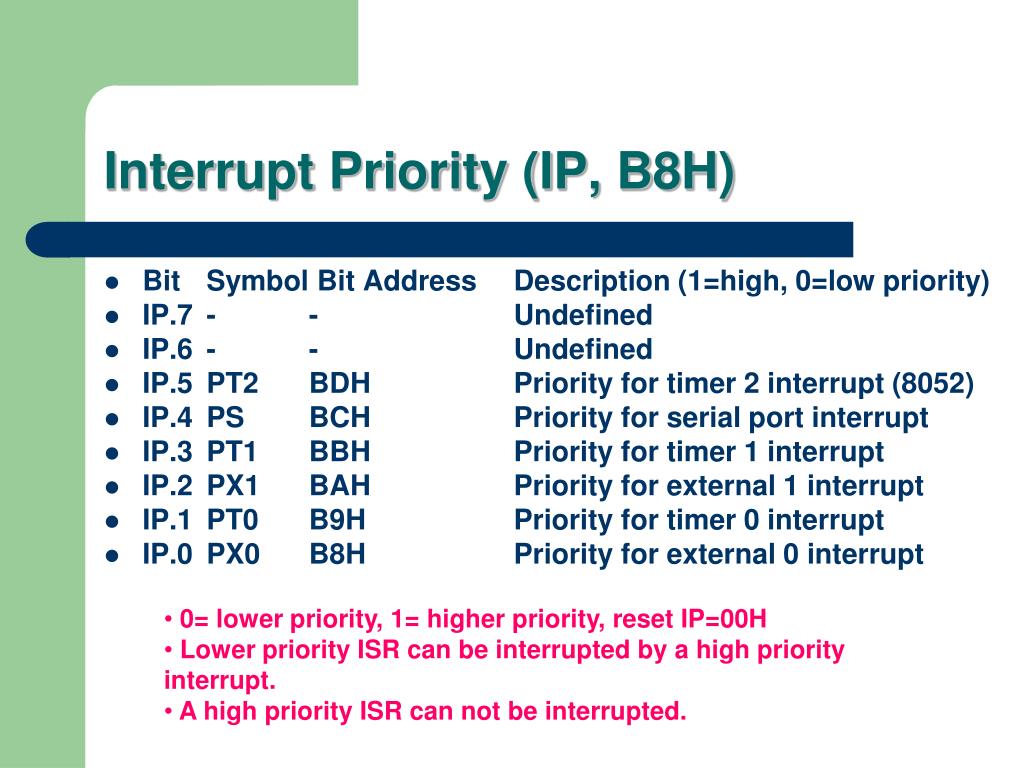 Interrupt Priority (IP, B8H) • Bit Symbol Bit Address Description (1=high, 0=low priority) • IP.7 - - Undefined • IP.6 - - Undefined • IP.5 PT2 BDH Priority for timer 2 interrupt (8052) • IP.4 PS BCH Priority for serial port interrupt • IP.3 PT1 BBH Priority for timer 1 interrupt • IP.2 PX1 BAH Priority for external 1 interrupt • IP.1 PT0 B9H Priority for timer 0 interrupt • IP.0 PX0 B8H Priority for external 0 interrupt • 0= lower priority, 1= higher priority, reset IP=00H • Lower priority ISR can be interrupted by a high priority interrupt. • A high priority ISR can not be interrupted.