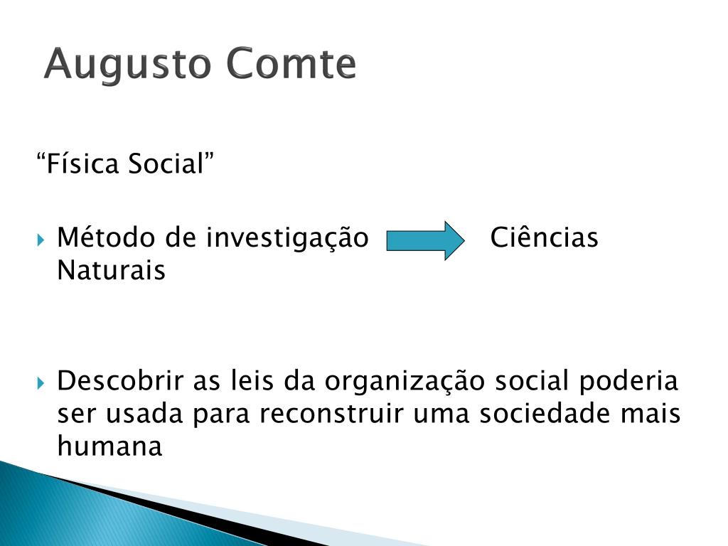 Augusto Comte “Física Social” • Método de investigação Ciências Naturais • Descobrir as leis da organização social poderia ser usada para reconstruir uma sociedade mais humana