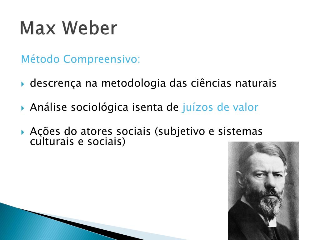 Max Weber Método Compreensivo: • descrença na metodologia das ciências naturais • Análise sociológica isenta de juízos de valor • Ações do atores sociais (subjetivo e sistemas culturais e sociais)