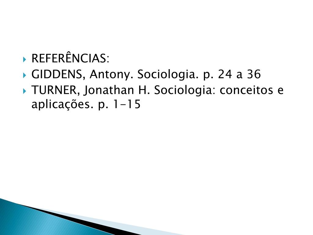 REFERÊNCIAS: • GIDDENS, Antony. Sociologia. p. 24 a 36 • TURNER, Jonathan H. Sociologia: conceitos e aplicações. p. 1-15