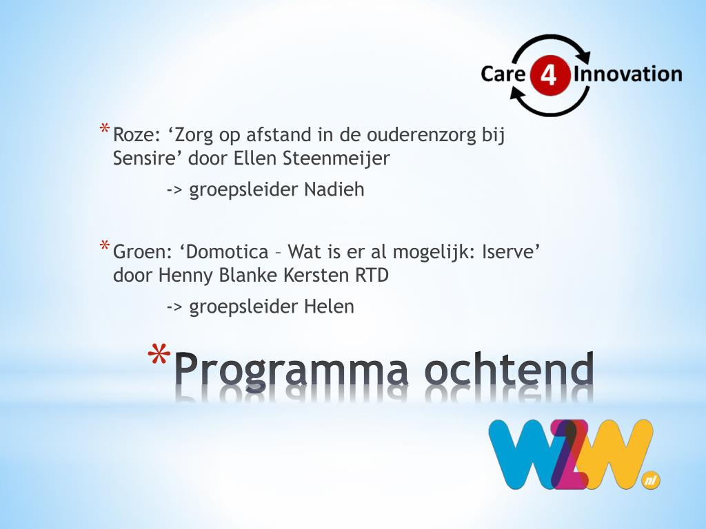 Roze: ‘Zorg op afstand in de ouderenzorg bij Sensire’ door Ellen Steenmeijer -> groepsleider Nadieh • Groen: ‘Domotica– Wat is er al mogelijk: Iserve’ door Henny Blanke Kersten RTD -> groepsleider Helen Programma ochtend