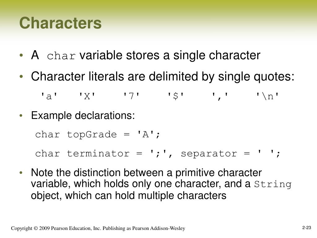 Characters • A char variable stores a single character • Character literals are delimited by single quotes: 'a' 'X' '7' '$' ',' '\n' • Example declarations: char topGrade = 'A'; char terminator = ';', separator = ' '; • Note the distinction between a primitive character variable, which holds only one character, and a String object, which can hold multiple characters