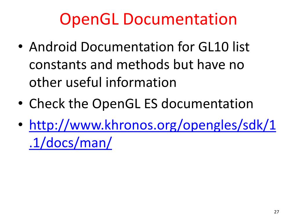 OpenGL Documentation • Android Documentation for GL10 list constants and methods but have no other useful information • Check the OpenGL ES documentation • http://www.khronos.org/opengles/sdk/1.1/docs/man/