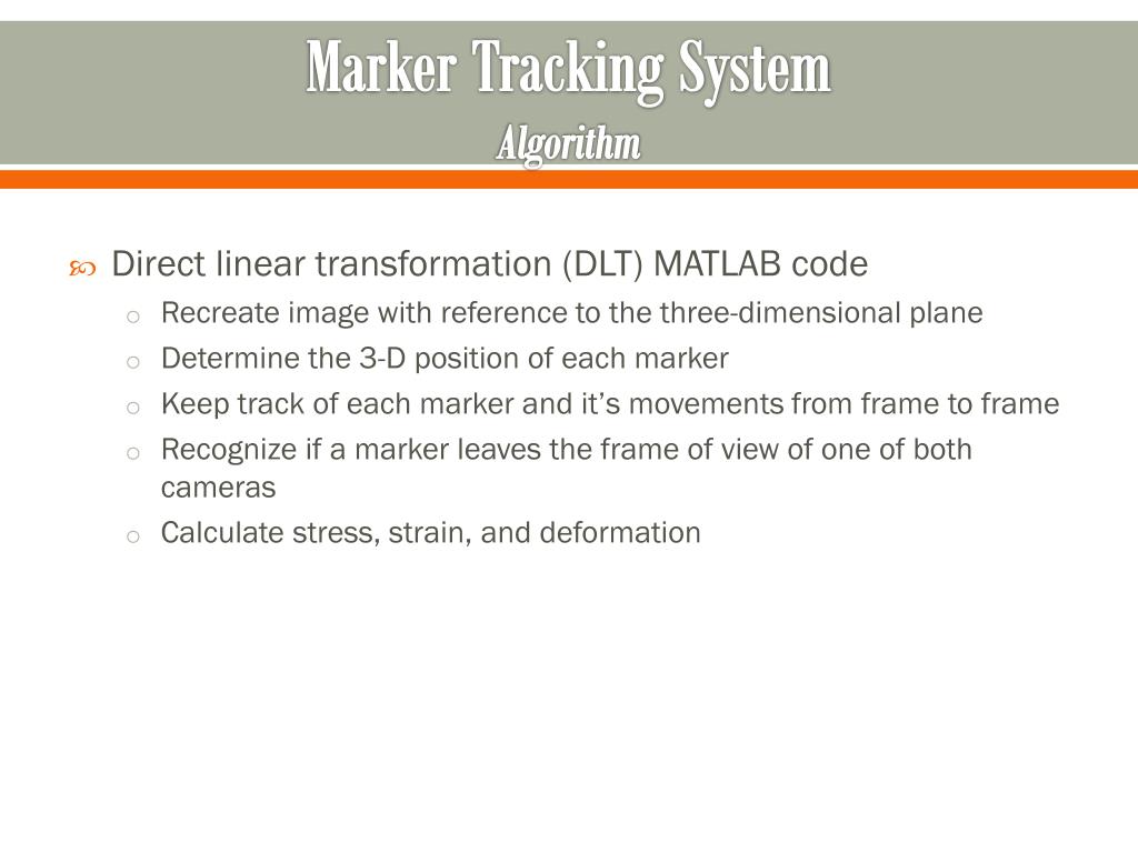 Marker Tracking SystemAlgorithm • Direct linear transformation (DLT) MATLAB code • Recreate image with reference to the three-dimensional plane • Determine the 3-D position of each marker • Keep track of each marker and it’s movements from frame to frame • Recognize if a marker leaves the frame of view of one of both cameras • Calculate stress, strain, and deformation