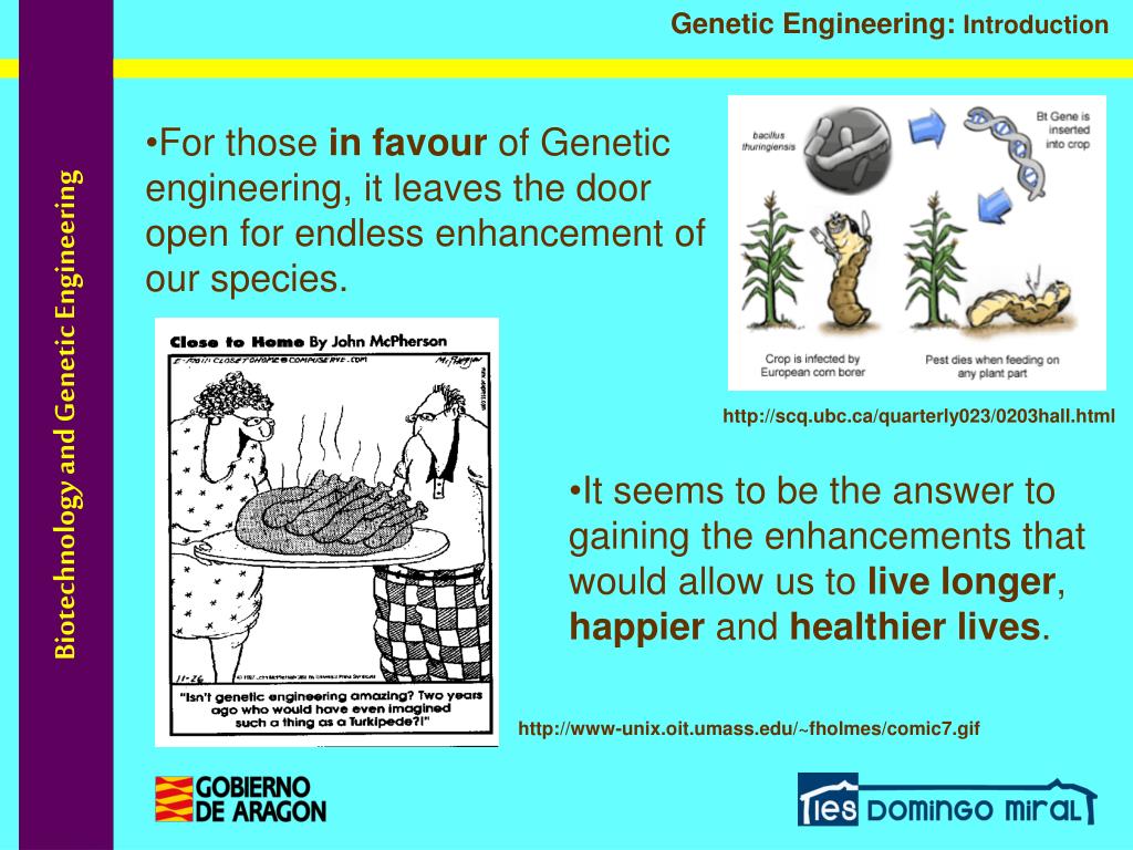 For those in favour of Genetic engineering, it leaves the door open for endless enhancement of our species. http://scq.ubc.ca/quarterly023/0203hall.html • It seems to be the answer to gaining the enhancements that would allow us to live longer, happier and healthier lives. http://www-unix.oit.umass.edu/~fholmes/comic7.gif