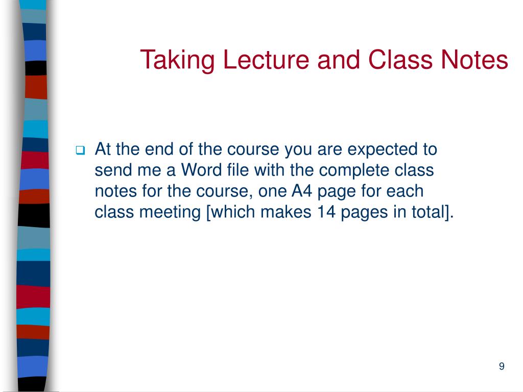 Taking Lecture and Class Notes • At the end of the course you are expected to send me a Word file with the complete class notes for the course, one A4 page for each class meeting [which makes 14 pages in total].