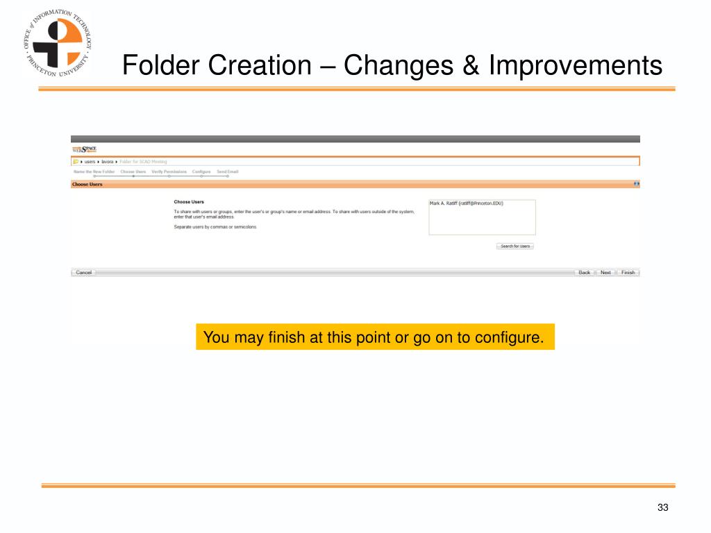 Folder Creation – Changes & Improvements • Bread crumb trail added to make process less confusing. • Drop down search is gone. Search takes place in box that lists names. • Configuration of the folder is now part of the creations process – no need to go to permissions.