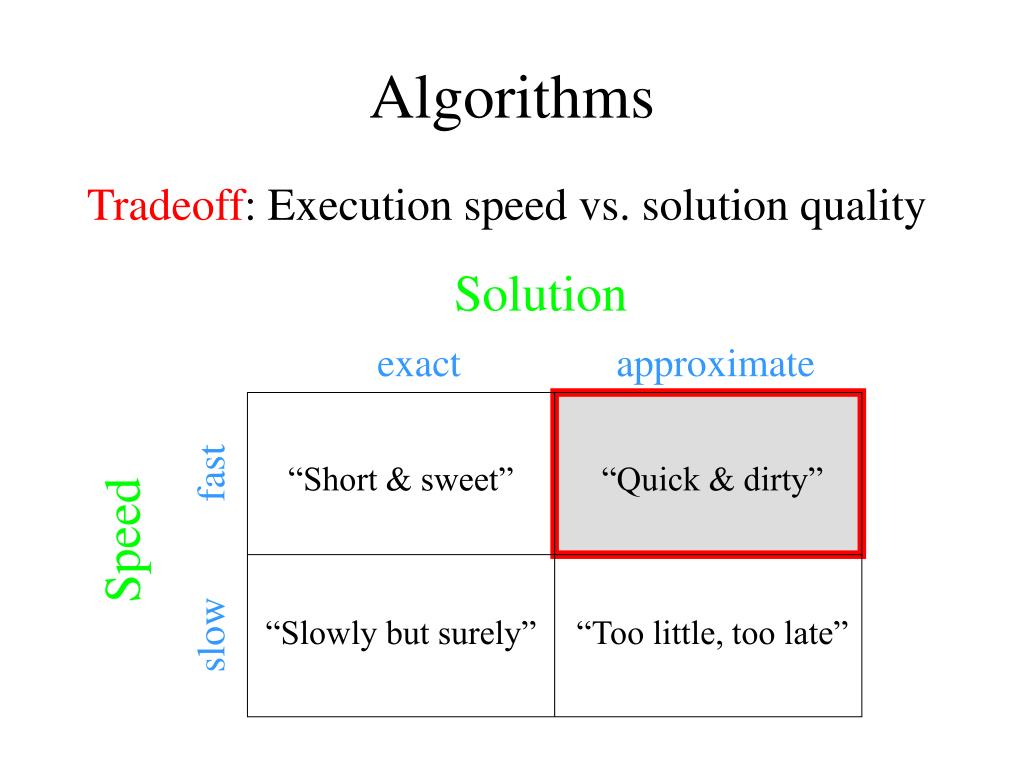 Solution exact approximate fast Speed slow Algorithms Tradeoff: Execution speed vs. solution quality “Short & sweet” “Quick & dirty” “Slowly but surely” “Too little, too late”