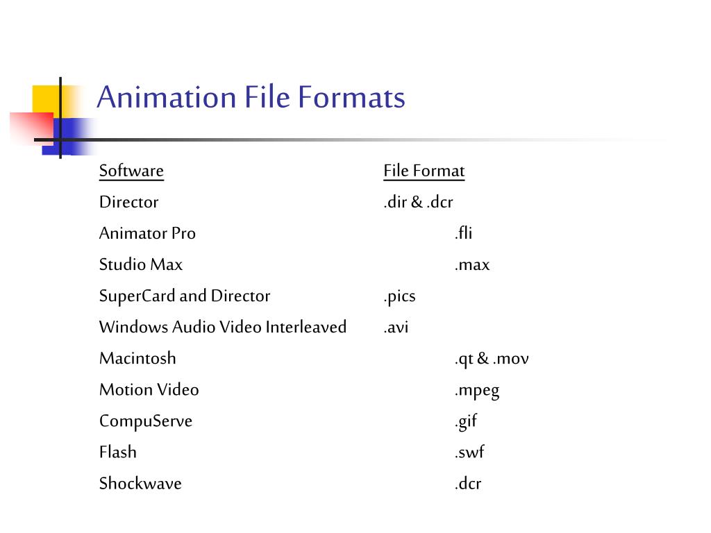 Animation File Formats SoftwareFile Format Director .dir & .dcr Animator Pro .fli Studio Max .max SuperCard and Director .pics Windows Audio Video Interleaved .avi Macintosh .qt & .mov Motion Video .mpeg CompuServe .gif Flash .swf Shockwave .dcr