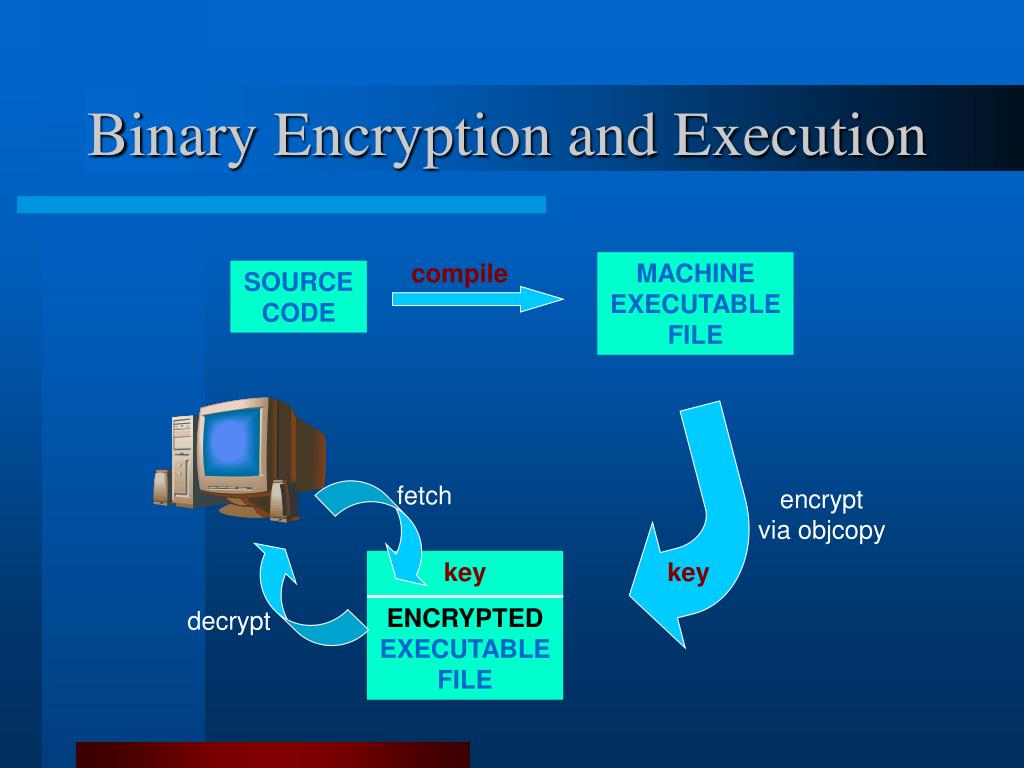 compile MACHINE EXECUTABLE FILE key ENCRYPTED EXECUTABLEFILE fetch encrypt via objcopy key decrypt Binary Encryption and Execution SOURCE CODE
