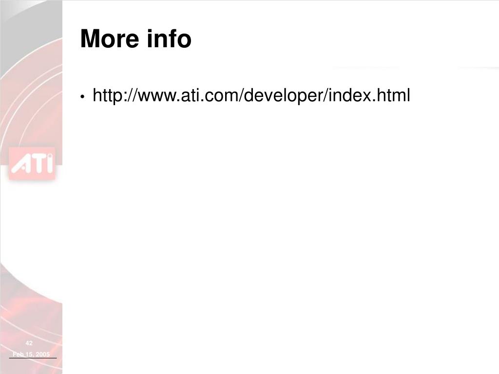 Program sizes • Most programs are very small • 100 virtual instructions would be a large program • Basic data type is a four element vector of floats • Integer data types are not yet available • Dynamic branching is new • Small amount of nesting allowed