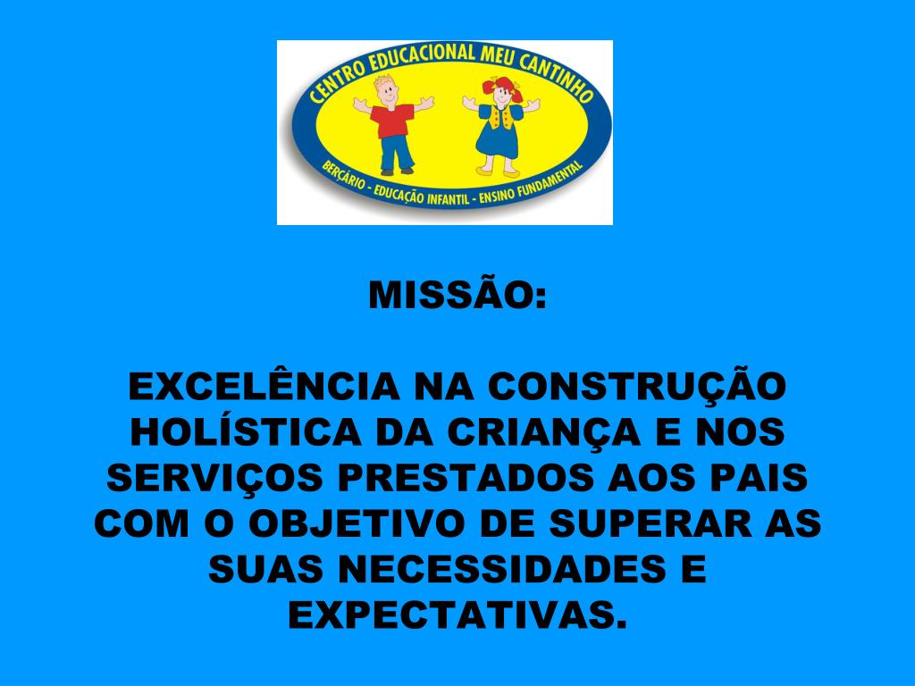 MISSÃO:EXCELÊNCIA NA CONSTRUÇÃO HOLÍSTICA DA CRIANÇA E NOS SERVIÇOS PRESTADOS AOS PAIS COM O OBJETIVO DE SUPERAR AS SUAS NECESSIDADES E EXPECTATIVAS.