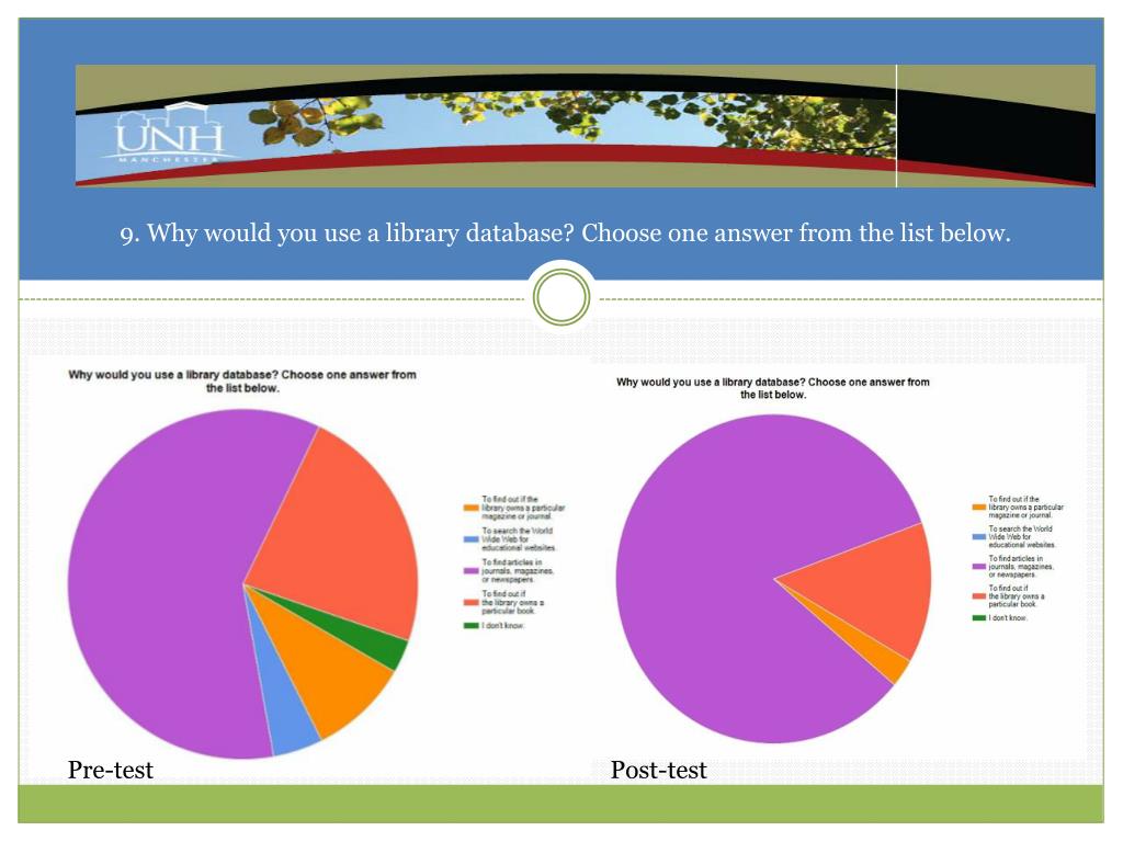 9. Why would you use a library database? Choose one answer from the list below. Pre-test Post-test