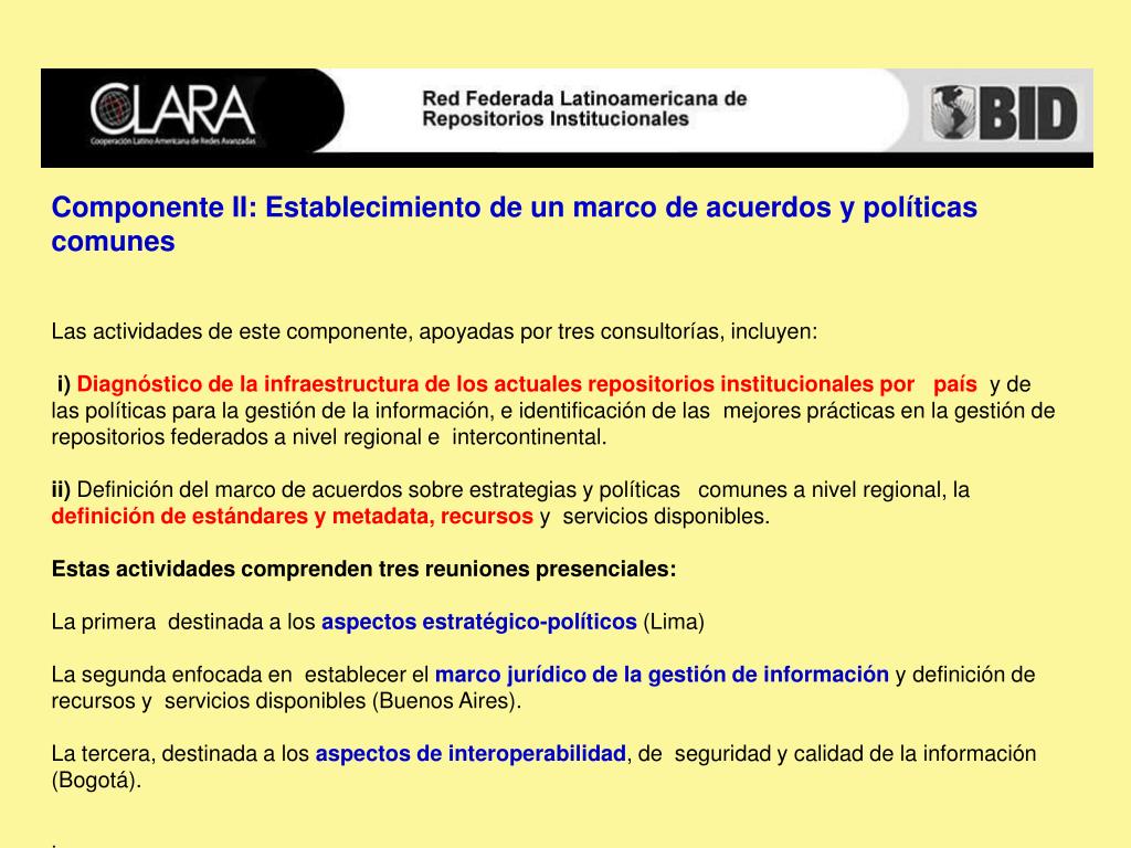 Componente II: Establecimiento de un marco de acuerdos y políticas comunes Las actividades de este componente, apoyadas por tres consultorías, incluyen: i) Diagnóstico de la infraestructura de los actuales repositorios institucionales por país y de las políticas para la gestión de la información, e identificación de las mejores prácticas en la gestión de repositorios federados a nivel regional e intercontinental. ii) Definición del marco de acuerdos sobre estrategias y políticas comunes a nivel regional, la definición de estándares y metadata, recursos y servicios disponibles. Estas actividades comprenden tres reuniones presenciales: La primera destinada a los aspectos estratégico-políticos (Lima) La segunda enfocada en establecer el marco jurídico de la gestión de información y definición de recursos y servicios disponibles (Buenos Aires). La tercera, destinada a los aspectos de interoperabilidad, de seguridad y calidad de la información (Bogotá). .