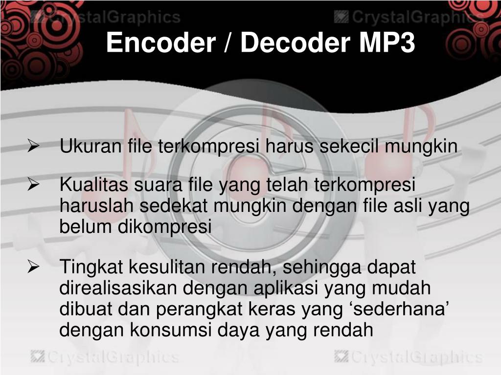 Encoder / Decoder MP3 • Ukuran file terkompresi harus sekecil mungkin • Kualitas suara file yang telah terkompresi haruslah sedekat mungkin dengan file asli yang belum dikompresi • Tingkat kesulitan rendah, sehingga dapat direalisasikan dengan aplikasi yang mudah dibuat dan perangkat keras yang ‘sederhana’ dengan konsumsi daya yang rendah
