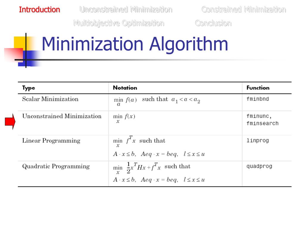 Introduction Unconstrained Minimization Constrained Minimization Multiobjective OptimizationConclusion Minimization Algorithm