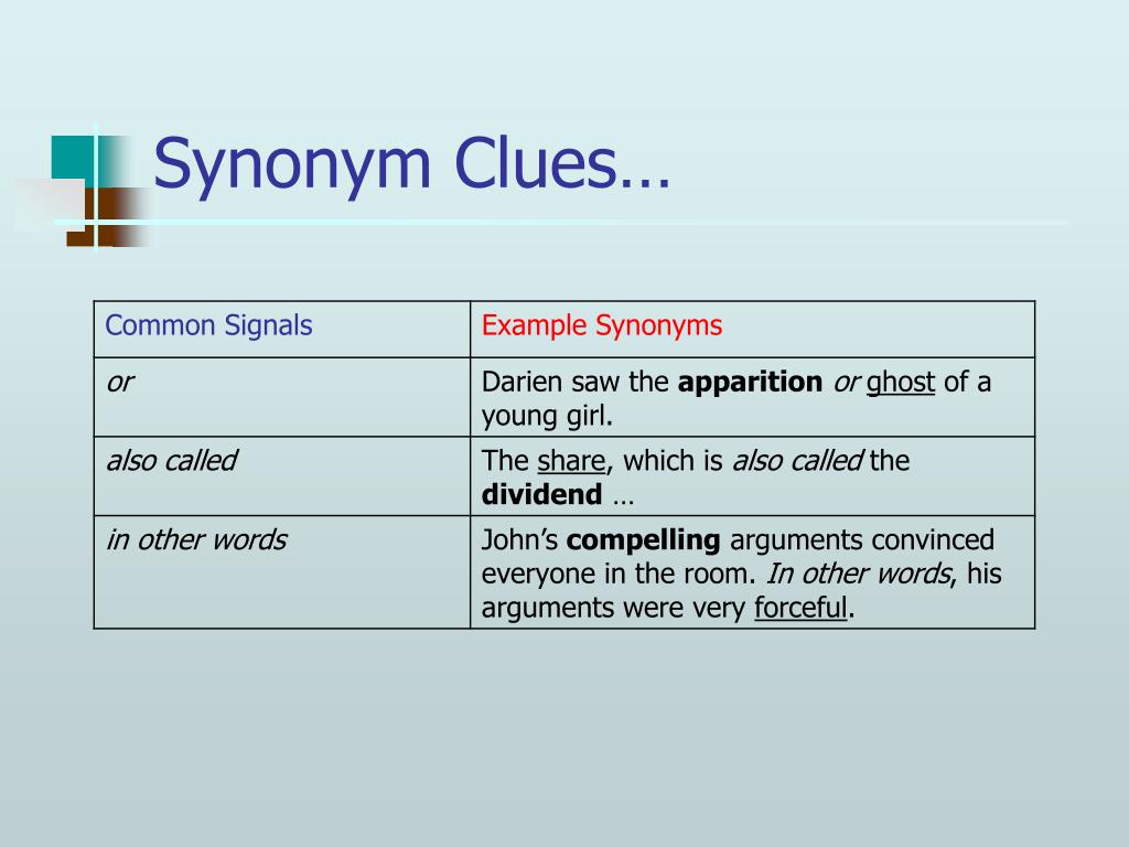 Synonym Clues syn·o·nym [sin-uh-nim] Noun- a word having the same or nearly the same meaning as another in the language, as joyful, elated, glad. • syn – “together”, “similar”, “the same” • onym – “word”, “name” • synonym clues – similar words in the sentence (or sentences) surrounding the unknown word