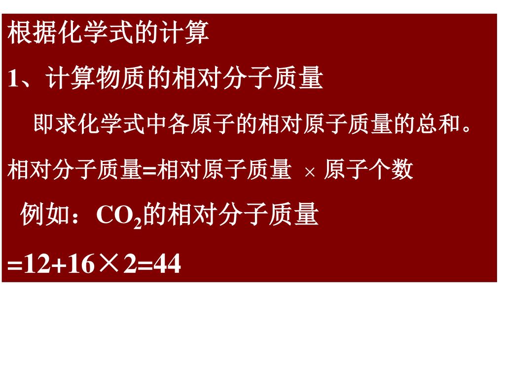 根据化学式的计算 1、计算物质的相对分子质量 即求化学式中各原子的相对原子质量的总和。 相对分子质量=相对原子质量 ×原子个数 例如:CO2的相对分子质量 =12+16×2=44